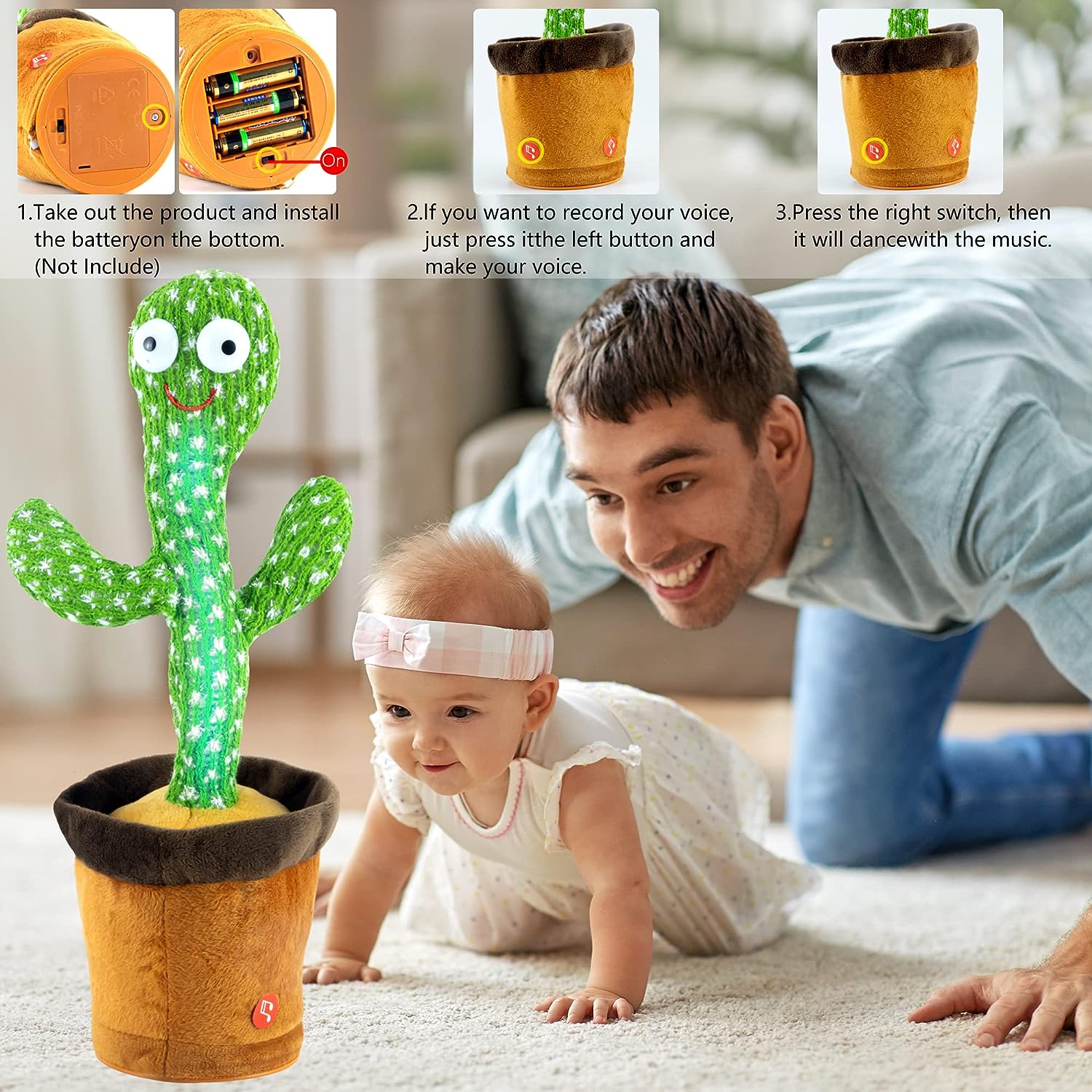 - ๐พ๐๐๐ฉ๐ช๐จ ๐๐ค๐ฎ ๐๐ฅ๐๐ง๐๐ฉ๐๐ค๐ฃ ๐๐ง๐ค๐๐๐จ๐จ: 1.At the bottom,remove the screw with a screwdriver, install AA batteries 3 pack, and tighten the screw. Black button at the bottom:ON; 2.Press the label button on the cactus,cactus can sing; 3.Press repeatedly to switch to the next song – 120 songs; 4.Left Label:Long press to record,15 seconds at most, and press to play sound — Right Label: press to play music,you can record after the song is paused.